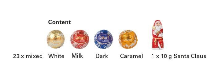 | Contents | 23 pieces of Lindt Sprüngli Lindor mini balls, mix. Behind the 24th window is a 10g Lindt Santa Claus |